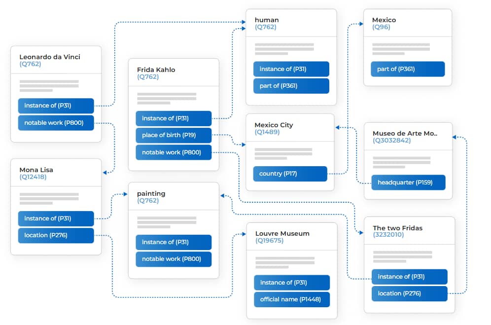 - No parsing needed: The graph-based Linked Open Data nature of Wikidata means you don’t need to parse messy HTML, wikitext, or other human-written text. Your algorithms immediately understand Wikidata, gaining rich context by traversing along its graph of knowledge.