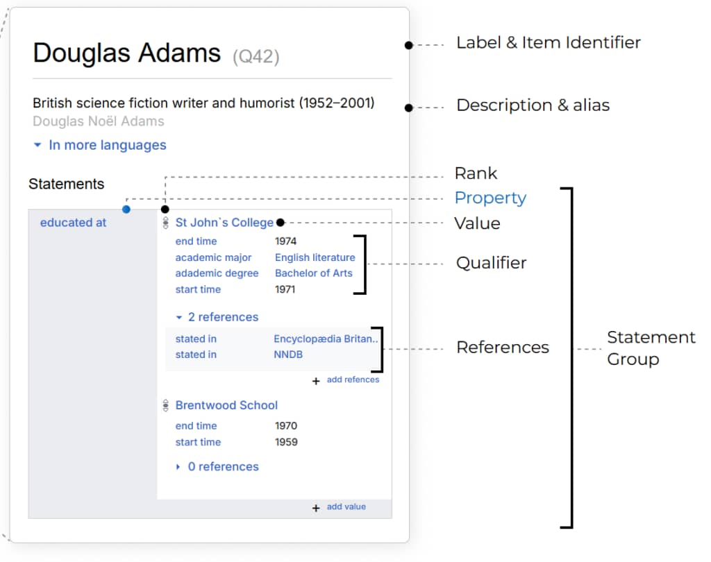 - Universal Identifier System: Every item has a unique Q-number (like Q42 for Douglas Adams). The same is true for Properties, which connect items together using a P-number (like P31 for ‘instance of’). A statement such as ‘Douglas Adams is a human’ can be translated into the machine-readable Wikidata statement Q42 → P31 → Q5. These universal Linked Open Data URI identifiers make up the largest online knowledge graph and connect different other open-source knowledge graphs together.